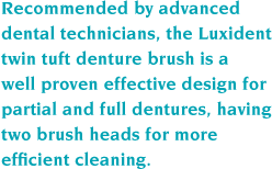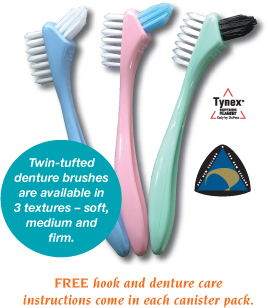 The brush is tufted with Dupont Tynex, recognised as the world’s most superior bristling material and is recommended and used by registered clinical dental technicians throughout New Zealand, Australia and Japan. This well proven denture brush is now totally manufactured in New Zealand and is backed with over 40 years experience in toothbrush manufacturing. Click here to see how you can market your dental laboratory. FREE hook and denture care |
